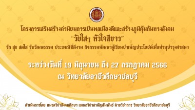 ประชาสัมพันธ์รับสมัคร นักเรียน นักศึกษา เข้าร่วมกิจกรรมตาม โครงการเสริมสร้างค่านิยมการเป็นพลเมืองดีและสร้างภูมิคุ้มกันทางสังคม วัยใสๆ หัวใจสีขาว รัก สุข สดใส รับวัฒนธรรม ประเพณีที่ดีงาม กิจกรรมพัฒนาผู้เรียนบำเพ็ญประโยชน์เพื่อทำนุบำรุงศาสนา หมวดวิชาสังคมศึกษา แผนกวิชาสามัญสัมพันธ์ ฝ่ายวิชาการ